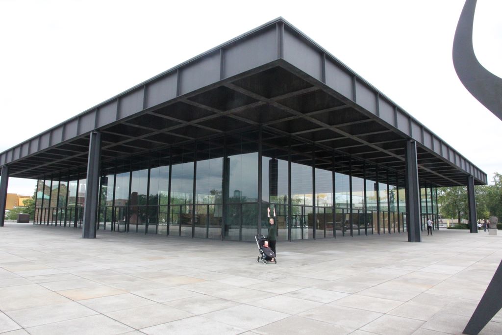 Berlin -- Rachel replaces a column - Mies van der Rohe's Neue Nationalgalerie